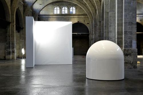 À partir de là, démarre l’expérience sensitive étrange des sculptures flottantes… Oui, elles bougent. Toutes. Il faut regarder longtemps, attentivement, pour enfin déceler le mouvement. Il est hyper présent pourtant, les sculptures se déplacent comme des créatures silencieuses, inquiétantes. Surtout la nappe noire au sol dont je suis restée persuadée un moment qu’elle ne fonctionnait pas. Mais si, elle rampe, comme une flaque qui glisserait au ras du sol. Ce n’est pas beau, les sculptures en elles-mêmes n’ont aucun intérêt esthétique. Par contre, les sensations sont vraiment incroyables. Vertiges, tout a l’air de bouger ensuite, même les colonnes solides de la nef… On peut se promener au milieu des « mollusques » (c’est l’artiste qui les compare), les barrières au sol sont là pour les empêcher de s’enfuir et non pour empêcher le spectateur de s’approcher.