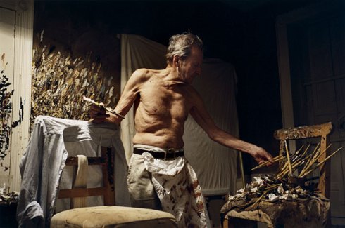 Et puis, il y a cette photo de lui dans son atelier, presqu’écartelé, entre peintures et pinceaux. Sur le mur, on aperçoit les couches de peinture, les taches plutôt, il essuyait son pinceau là.