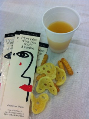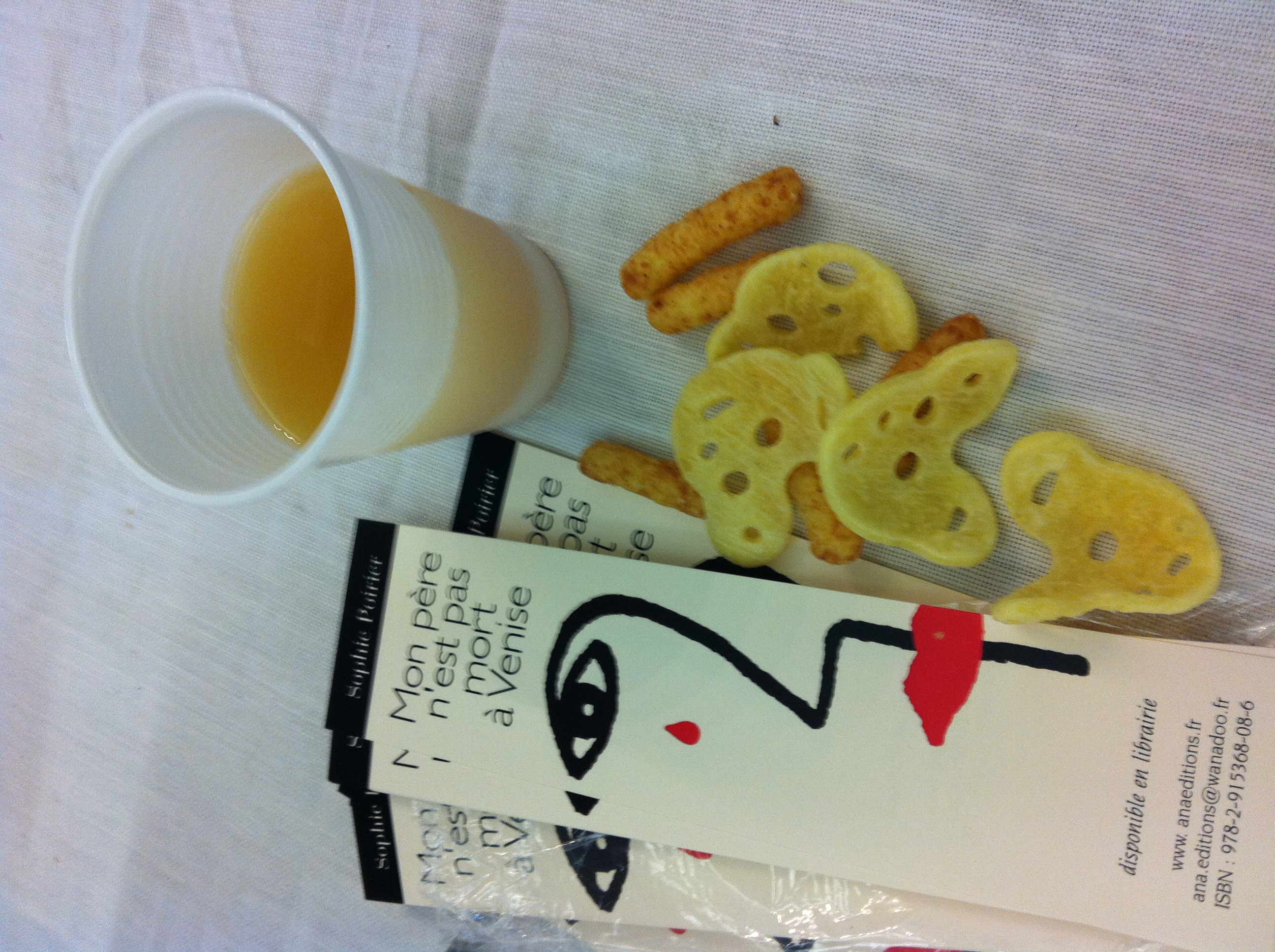 Au moment du café, une dame très âgée, habillée d’un chemisier pur 70’s (le motif forcément, mais surtout le col, c’est d’époque, obligé) vient me voir. Elle fait partie des auto-édités. Elle me pose quelques questions en feuilletant La libraire a aimé, tout en parlant : »Je ne vais pas très bien en ce moment. Si je devais acheter un livre, ça serait le votre. Mais je suis fragile. Rien que de lire le mot « mort »… – elle me montre la couverture de Mon père n’est pas mort à Venise -«