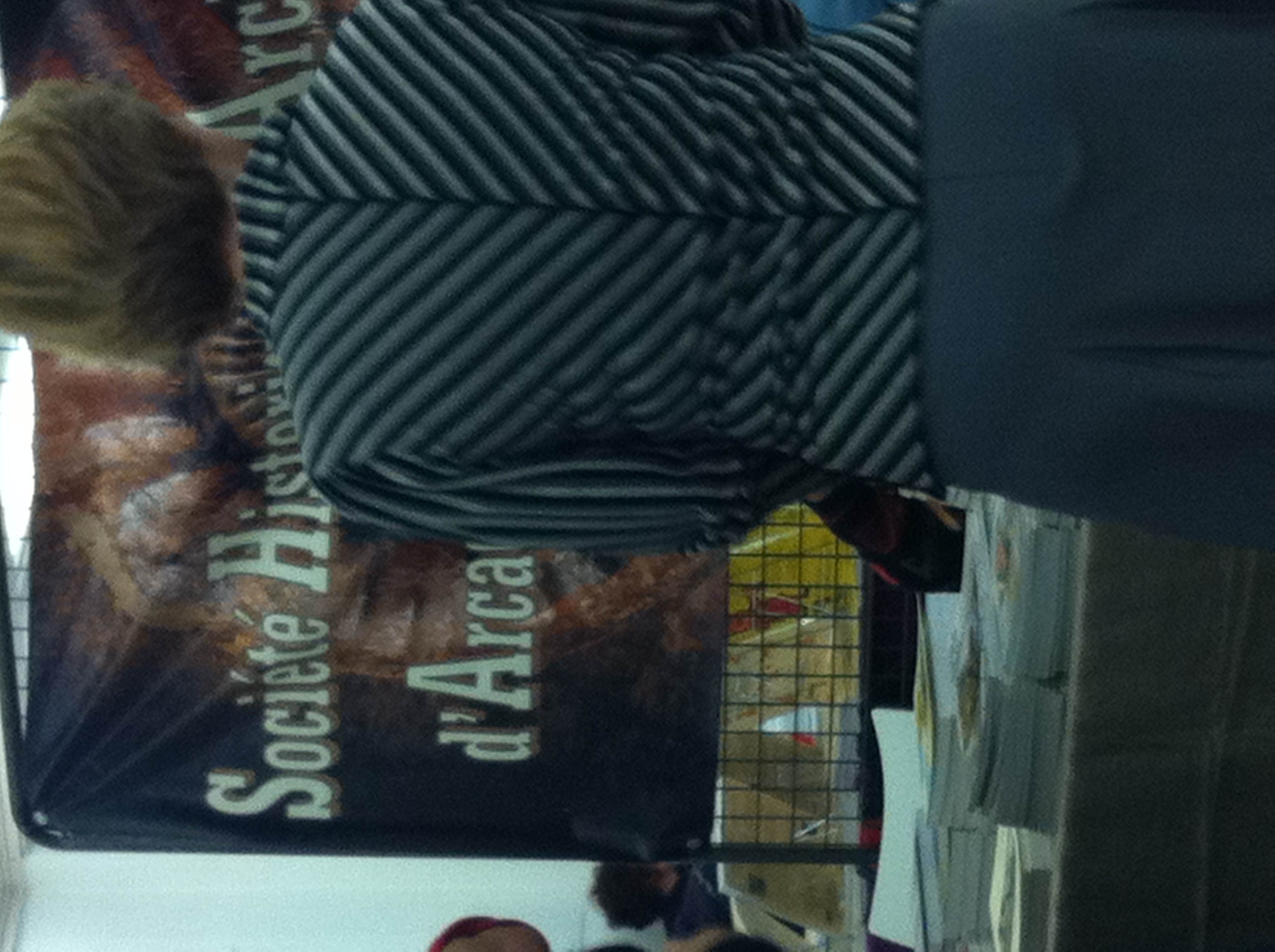 À côté du stand (comme à la foire expo, on dit un stand) de mon éditeur, c’est un bouquiniste : lui, il vend les livres à 2 €. En face de moi : l’Association historique et archéologique du bassin d’Arcachon et la brochette d’auteurs auto-édités (qui payent pour être édités). Plus loin, c’est « Raconte-moi Papy » qui propose de vous écrire votre livre de souvenirs (un beau cadeau de Noël pour vos petits enfants).