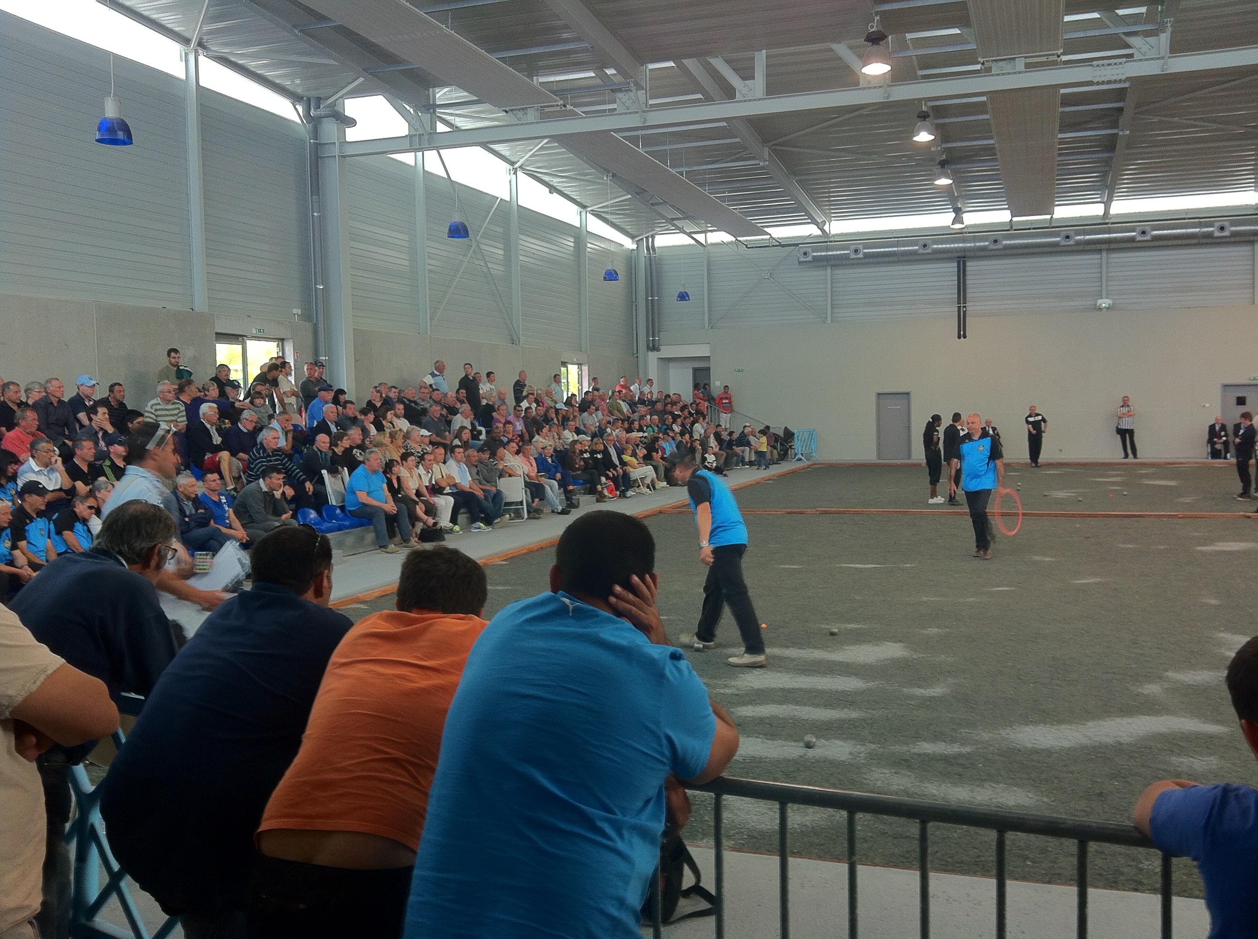 C’est certain, Bassens est dans la place, plusieurs équipes pour plusieurs finales en même temps : mixte, féminin, senior, triplette, doublette, vétéran, et même la longue. L’Espace est divisé en 7 terrains. Avec les panneaux géants d’affichage pour les scores, tout ce monde en famille dans les gradins, les juges-arbitres, ça donne une ambiance qui me rappelle un match de base-ball vu j’avais vu au Yankees Stadium à NY… (en plus petit, en moins long et sans les Pom Pom girls évidemment).