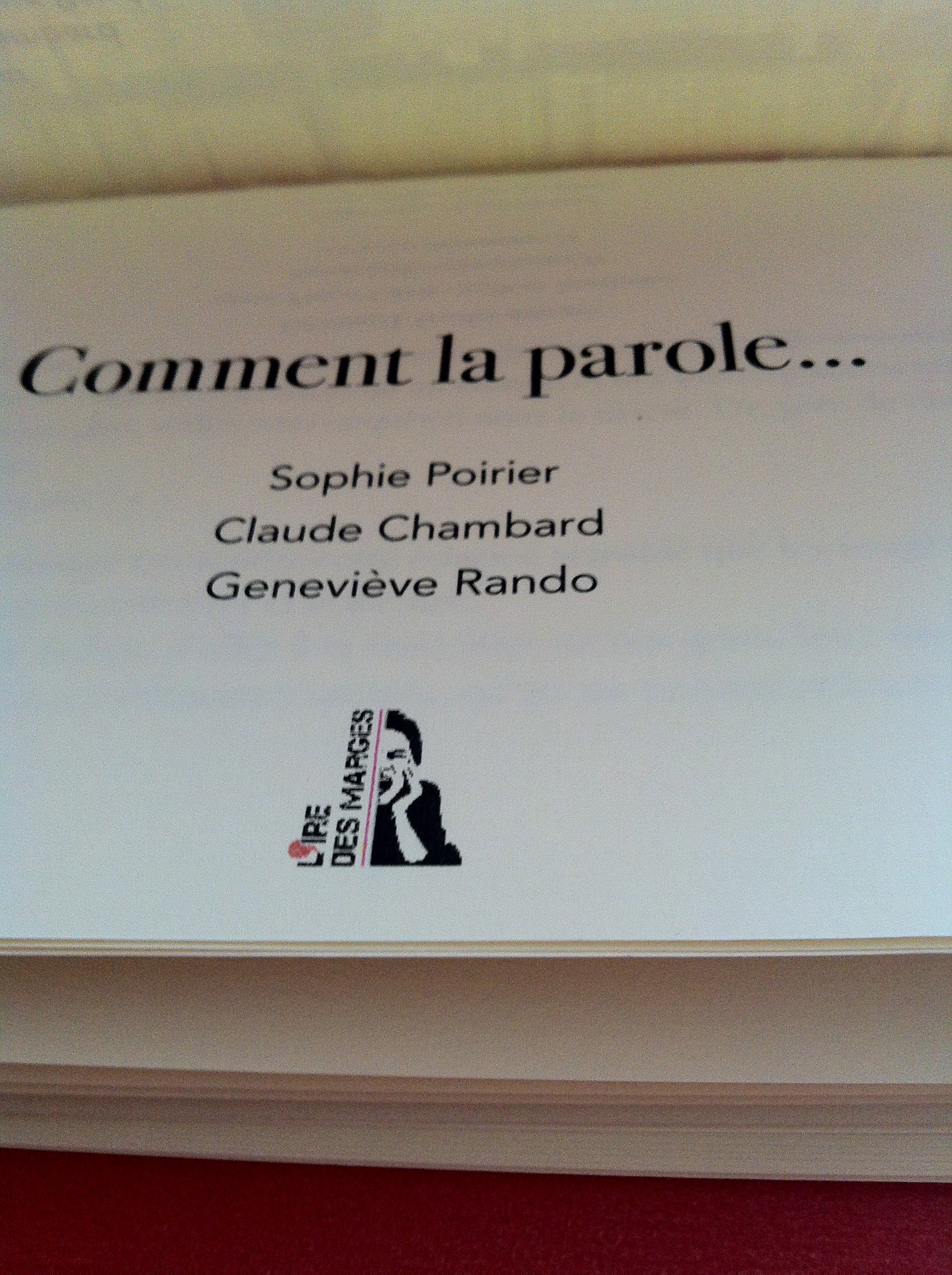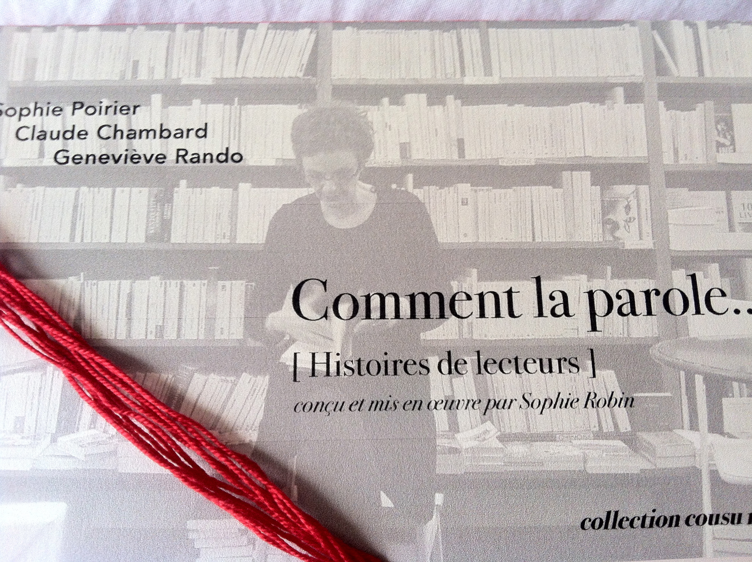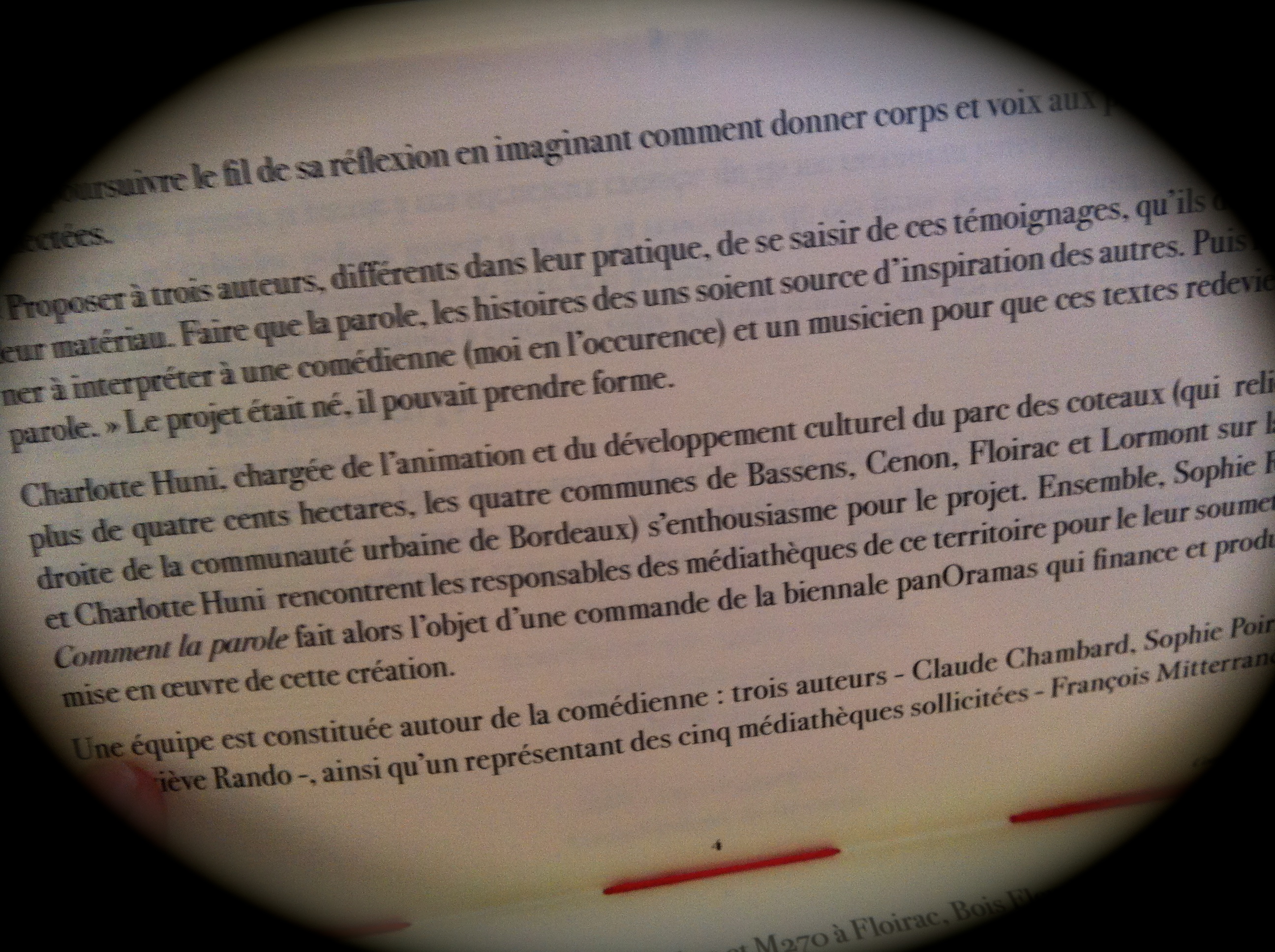 « Sophie Robin et le collectif Jesuisnoirdemonde ont rencontré et collecté la parole d’une centaine de lecteurs des cinq médiathèques de la Rive Droite. De cette parole, Sophie Poirier, Geneviève Rando et Claude Chambard ont produit trois récits. Le spectacle Comment la parole est né dans le parc des Coteaux lors de panOramas 2012. «