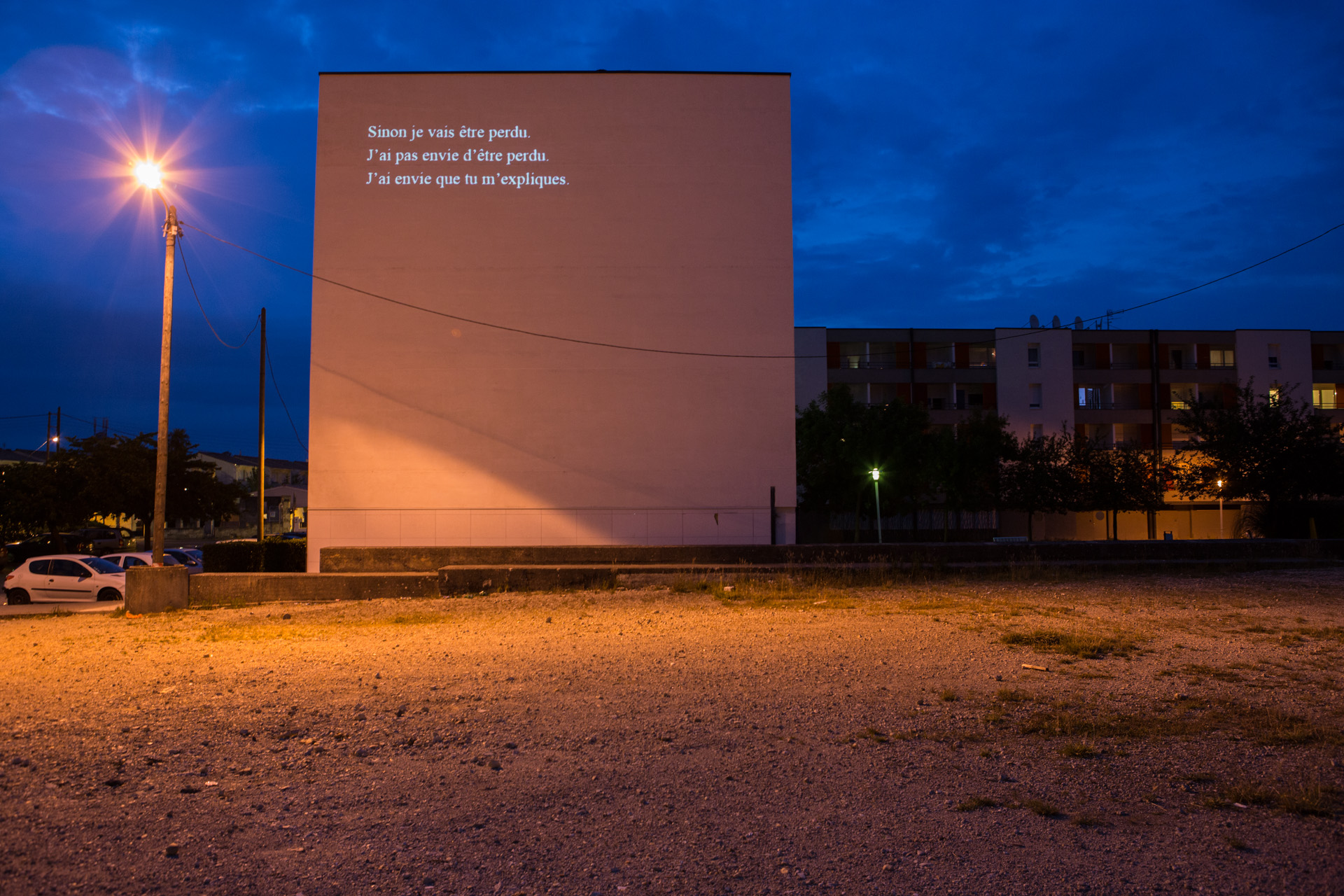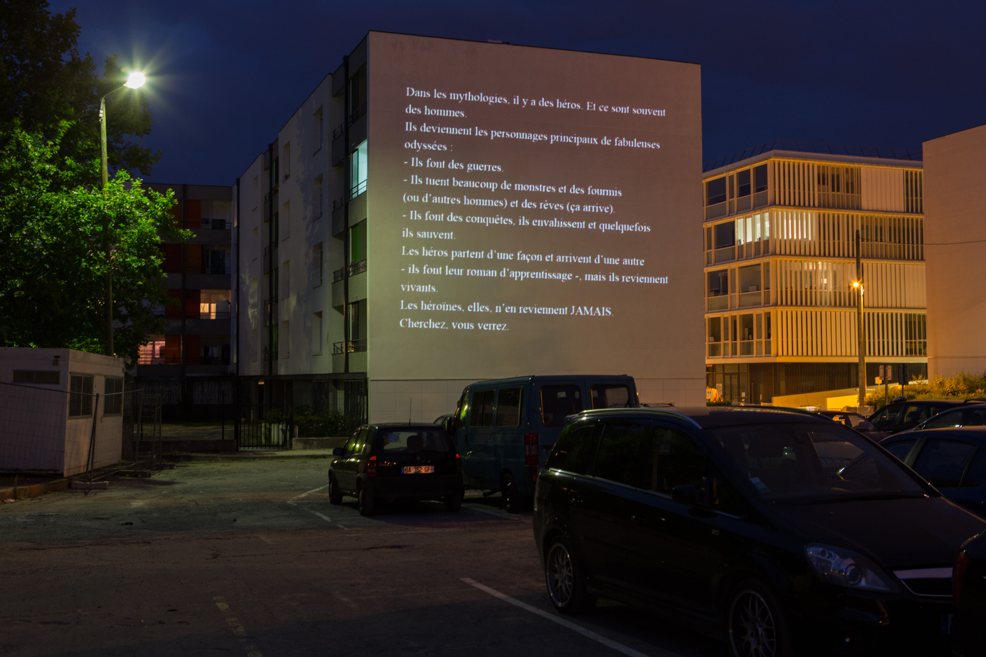 Lors de son intervention, il m’a invitée à montrer sur les façades des immeubles autour du QG des courts extraits du texte de ma Mythologie en cours d’écriture. Dans le cadre de la prochaine édition en Septembre 2014, Charlotte Hüni, « commissaire d’exposition » de la biennale PanOramas (à laquelle Olivier Crouzel est artiste invité) m’a demandé d’écrire la Mythologie de l’événement et du vaste territoire sur lequel il se déroule.