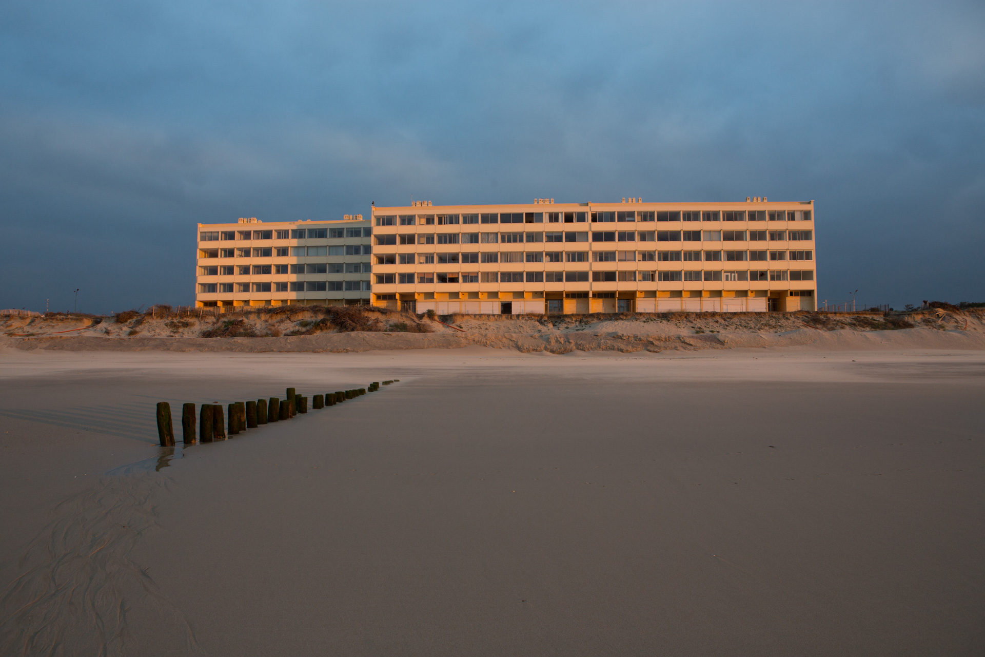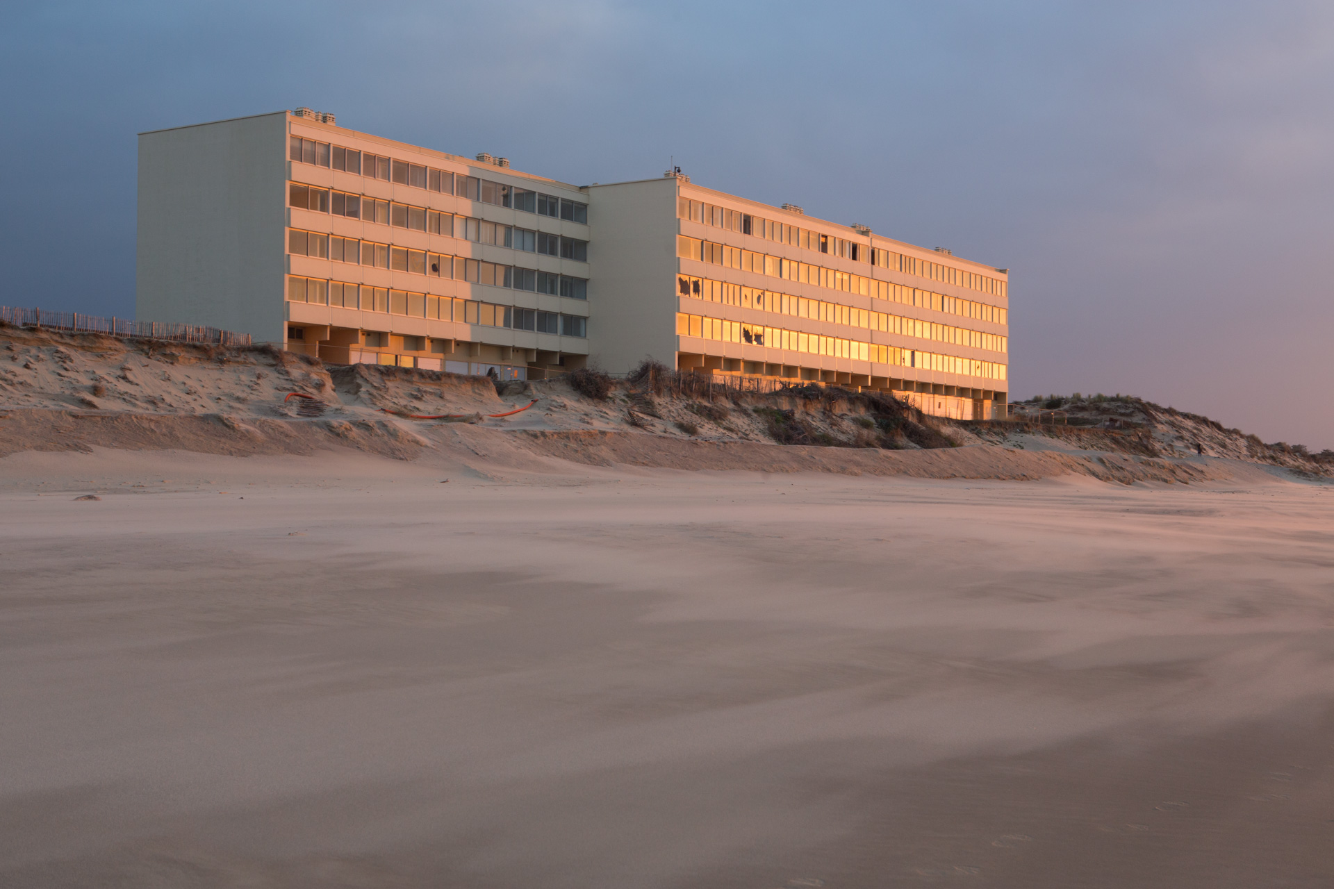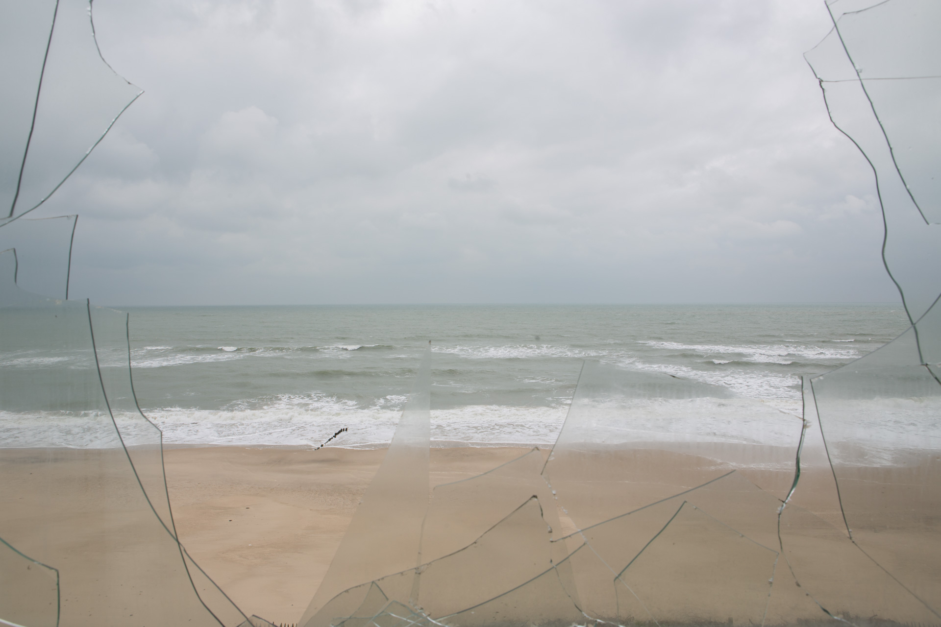 Avec un fantasme : se tenir derrière une des fenêtres, voir la mer depuis l’intérieur. Il est planté dans le sable – « en première ligne ». Avec l’érosion, la première ligne est passée de la situation géographique privilégiée « vue sur la mer » au statut de catastrophe inévitable. Face au risque des forts coefficients à venir et des hivers bourrasques, le préfet a ordonné son évacuation définitive. L’immeuble est au bord de sa fin.