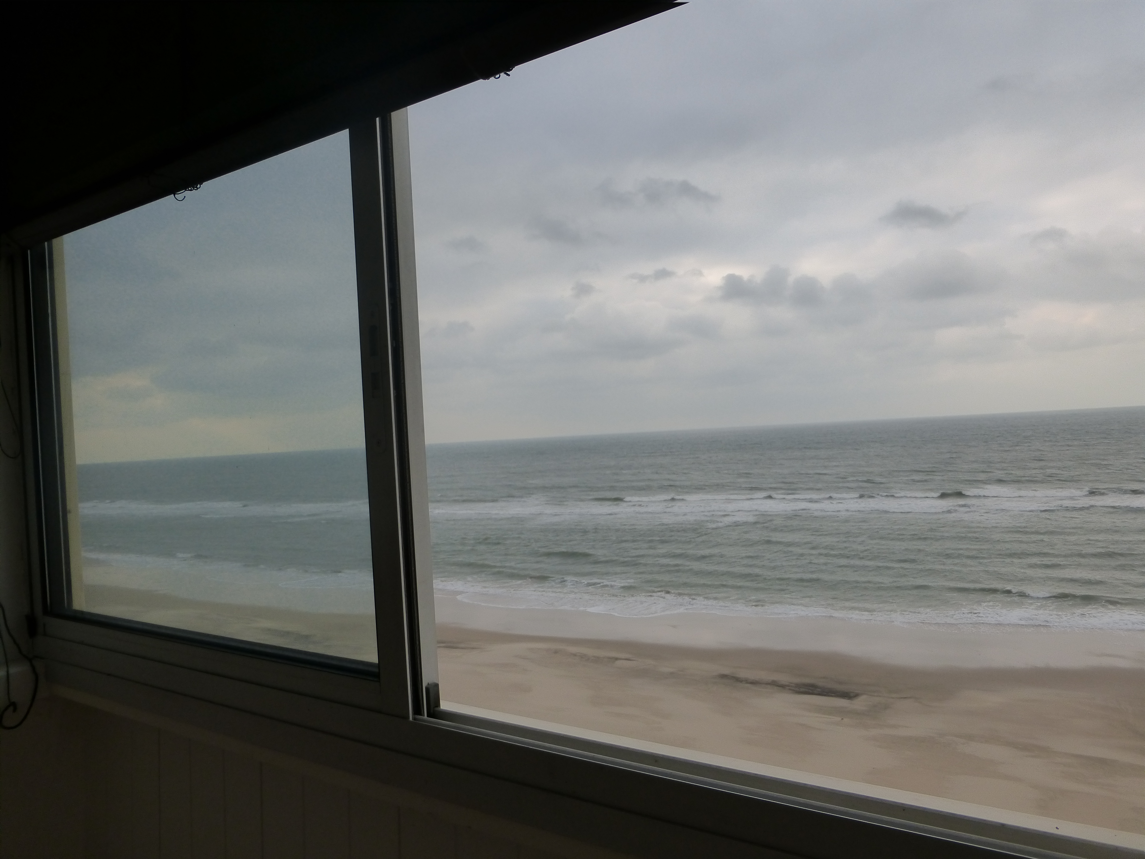 Maintenant, tous les rideaux et tous les stores claquent à cause du vent qui s’engouffre. Presque toutes les fenêtres côté mer sont cassées, sont brisées, éventrées, le vent s’engouffre partout, le vent siffle.