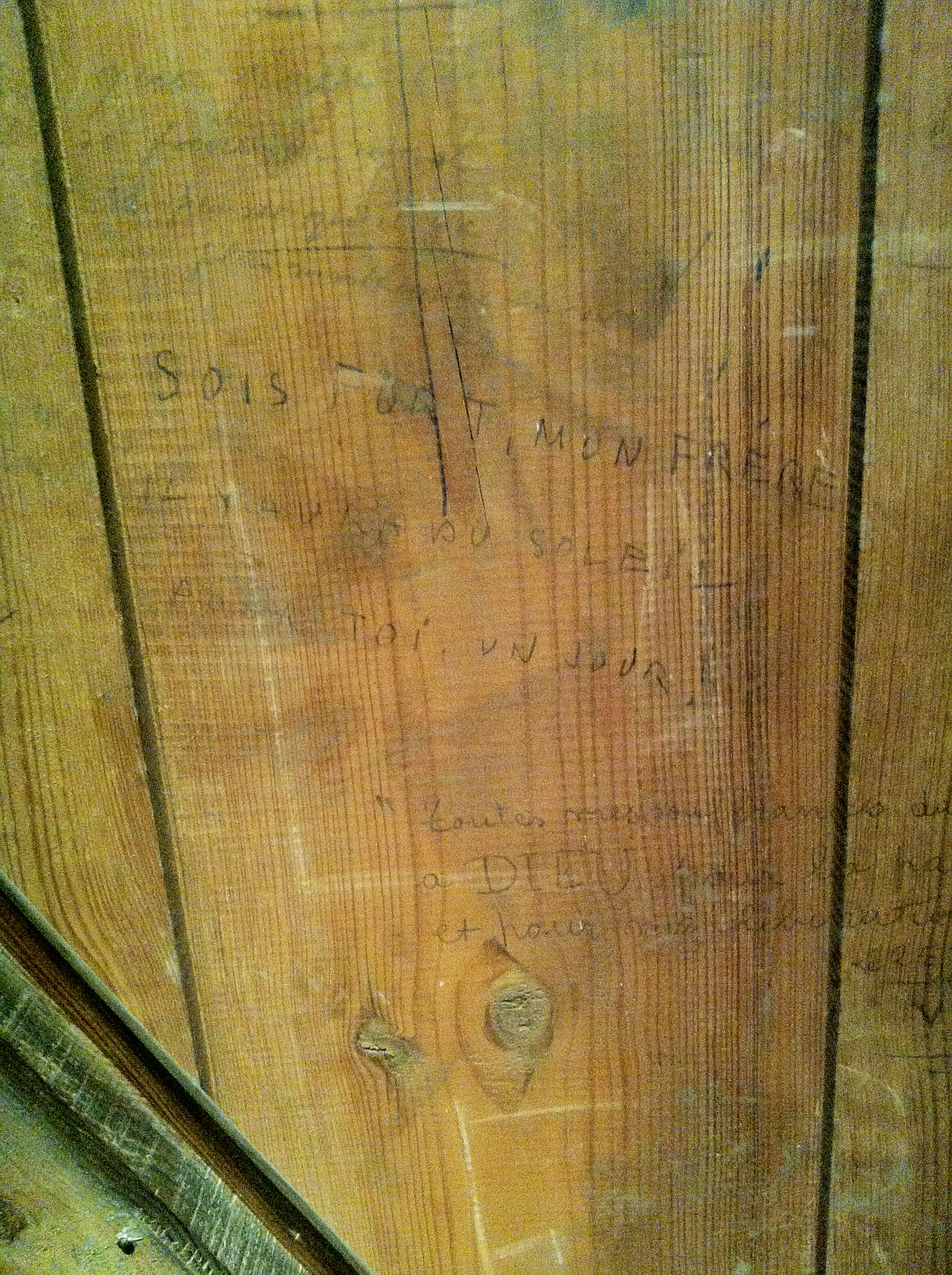 Sont installées en vitrine des boîtes contenant de la terre, des morceaux des différents camps de concentration. Dans un angle, je fais face à une porte de bois, il s’agit de la porte d’une des cellules du Fort du Hâ. Des inscriptions sont écrites au crayon ou creusées, je déchiffre des messages, des prières principalement, des espoirs : « Sois fort mon frère il y aura aussi du soleil pour toi ».