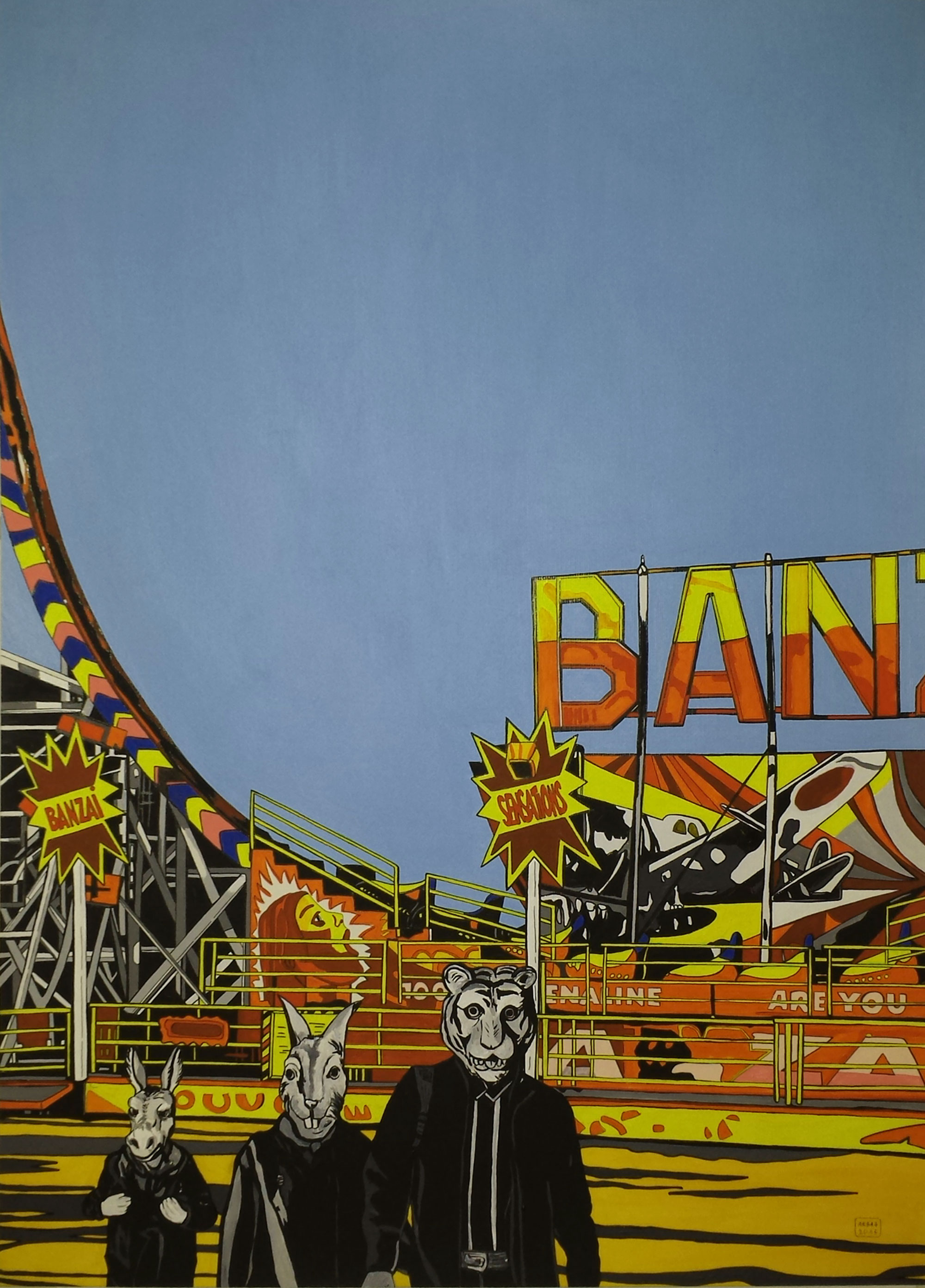 J’ai reçu ses premières images : l’étrangeté de celui/celle qui pose devant des manèges souvent vides, le décor figé et vif, des auto-tamponneuses désertées, et pourtant cette spontanéité du personnage, comme s’il ne se rendait compte de rien, ni du visage qu’il a, et quand même se prendre en photo devant et sourire.