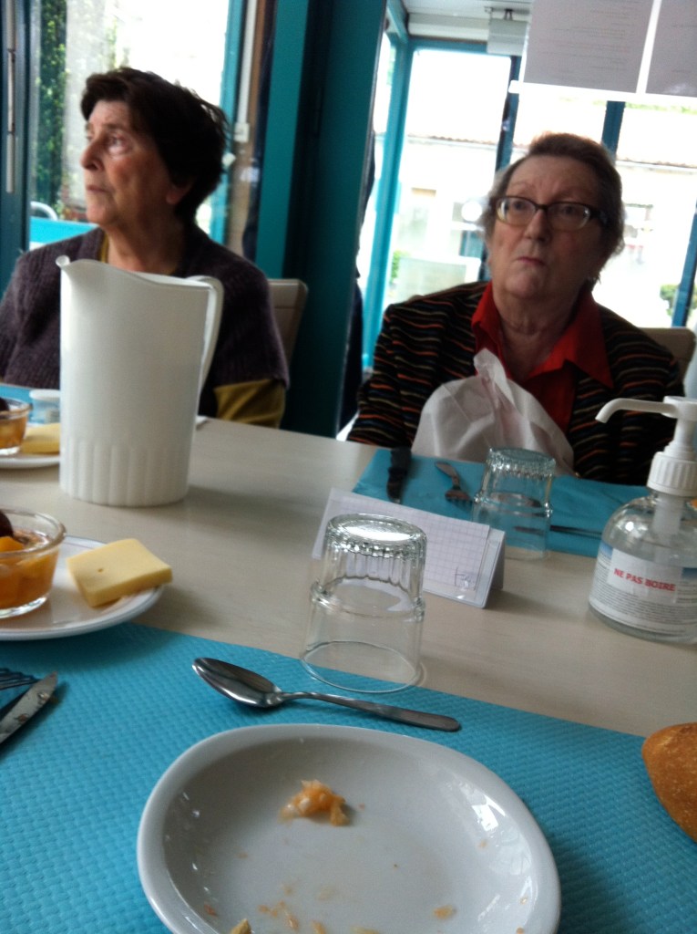 On me regarde. J’ai l’impression d’être un bébé. La dame de la cantine m’amène à ma table. Il y a mon nom écrit. C’est à cause des régimes que chacun peut avoir à suivre, alors on a une étiquette à côté de son assiette. Je salue mes voisines de table… J’ai envie de rire tellement elles sont vieilles et moches et sourdes. Je les prends en photo discrètement. Et j’envoie un sms à mes amis : Mes nouvelles copines !