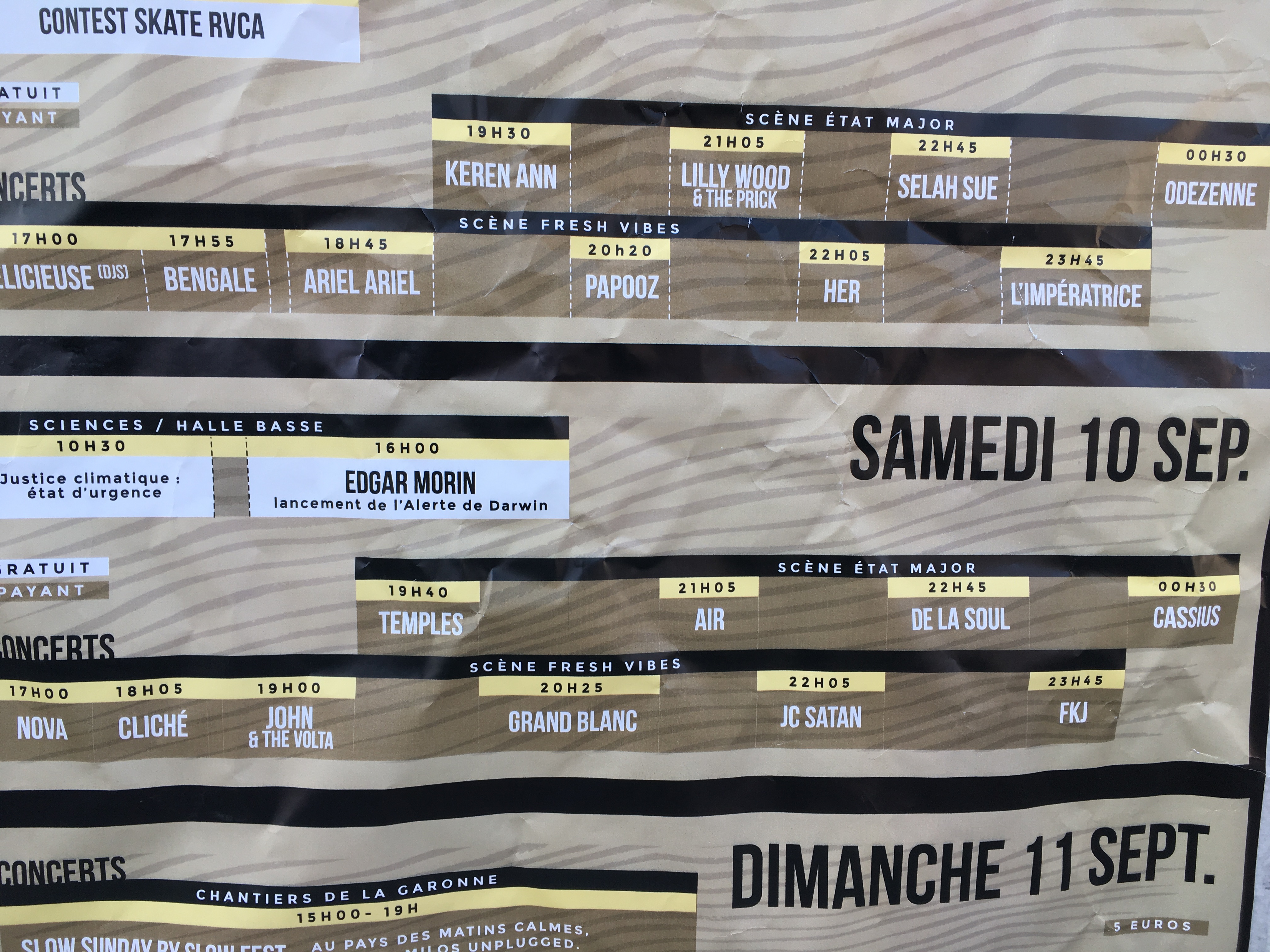 Chacun à sa façon s’y met. Par exemple, la chanteuse mignonnette du groupe L’impératrice « les océans faut les protéger, nous on aime les océans ». Soit. Le gars à côté de moi commente le groupe : Les musiciens, ils assurent, mais elle, elle fait trop sa sirène, elle sert à rien…