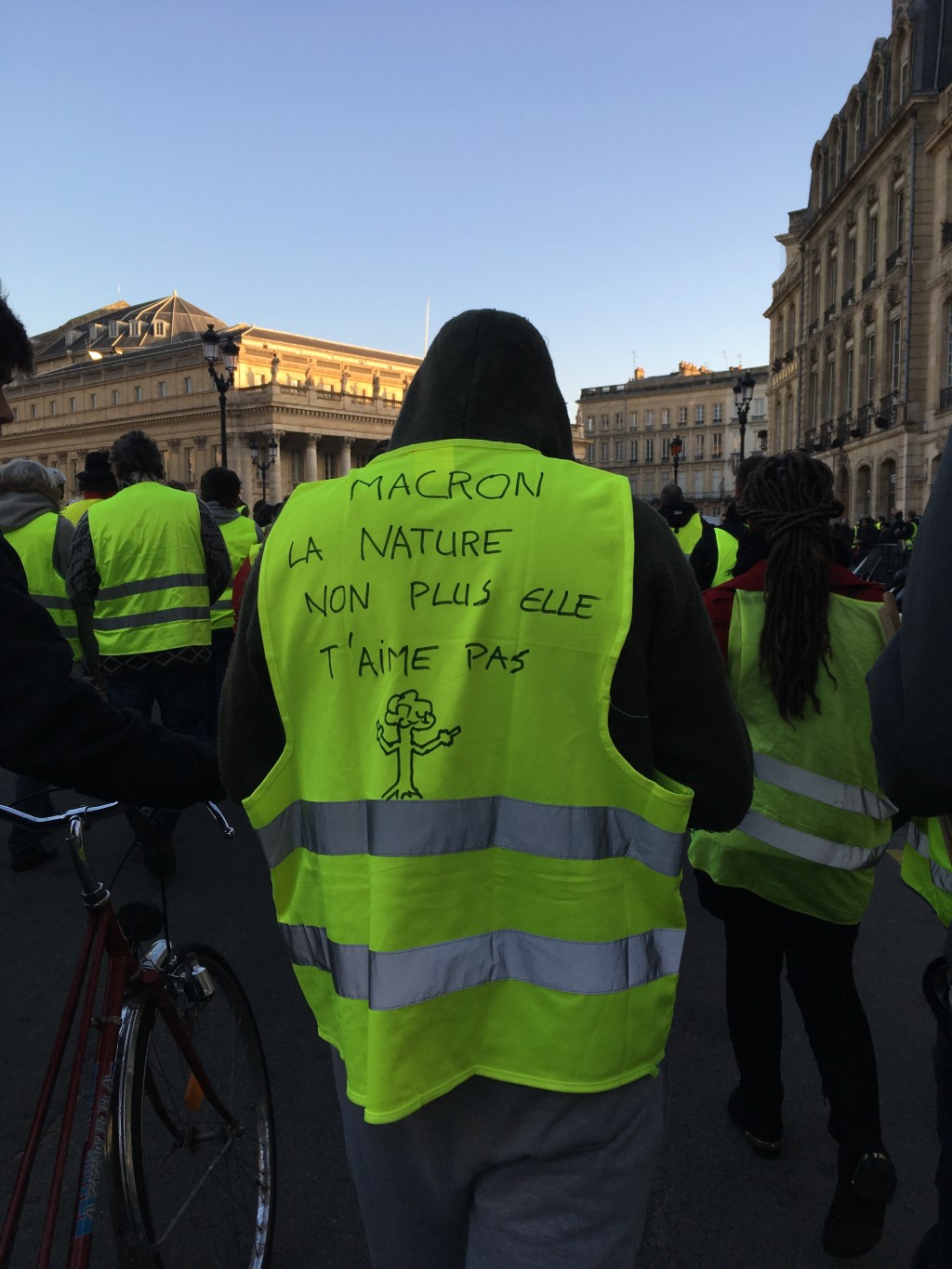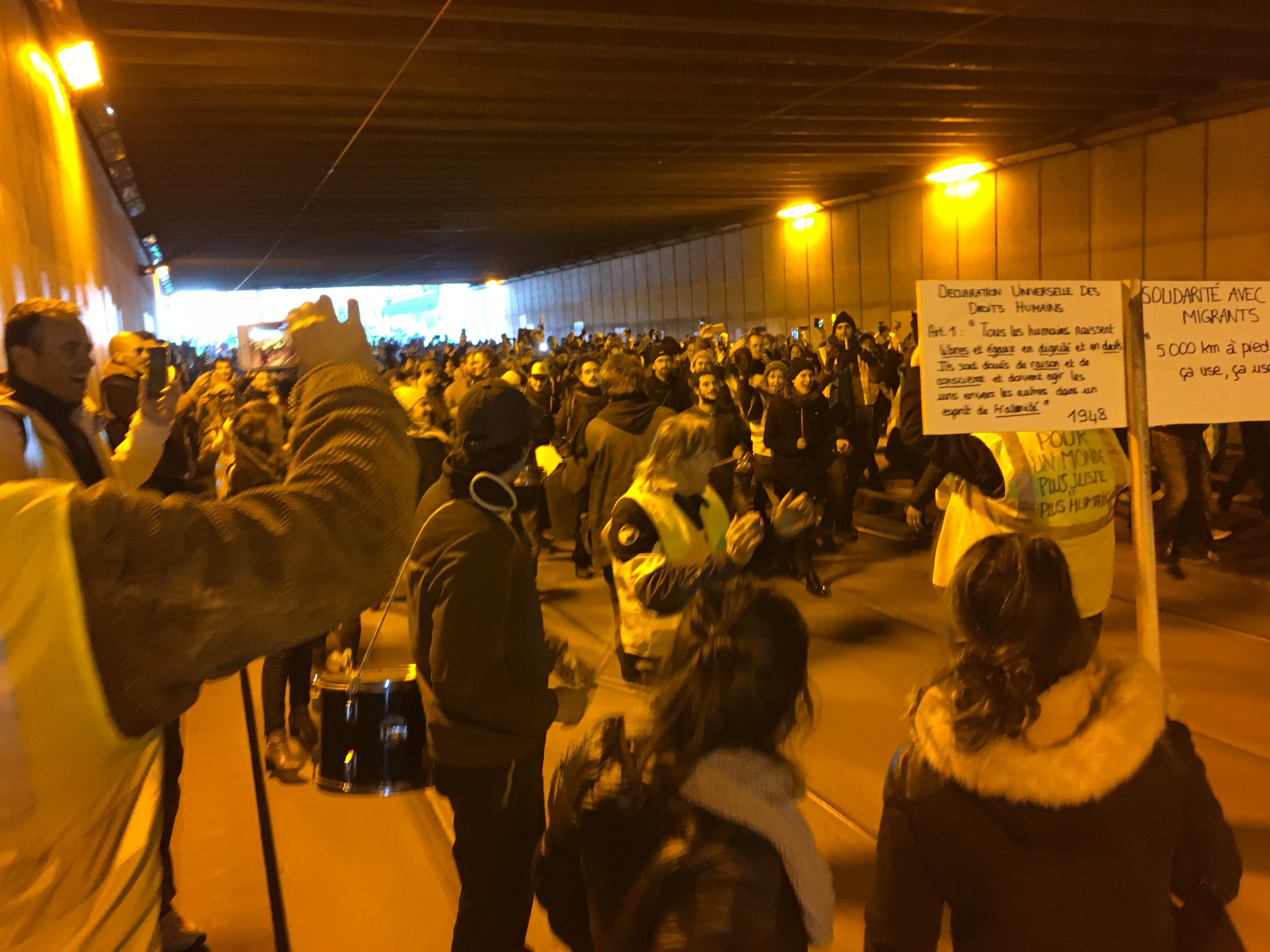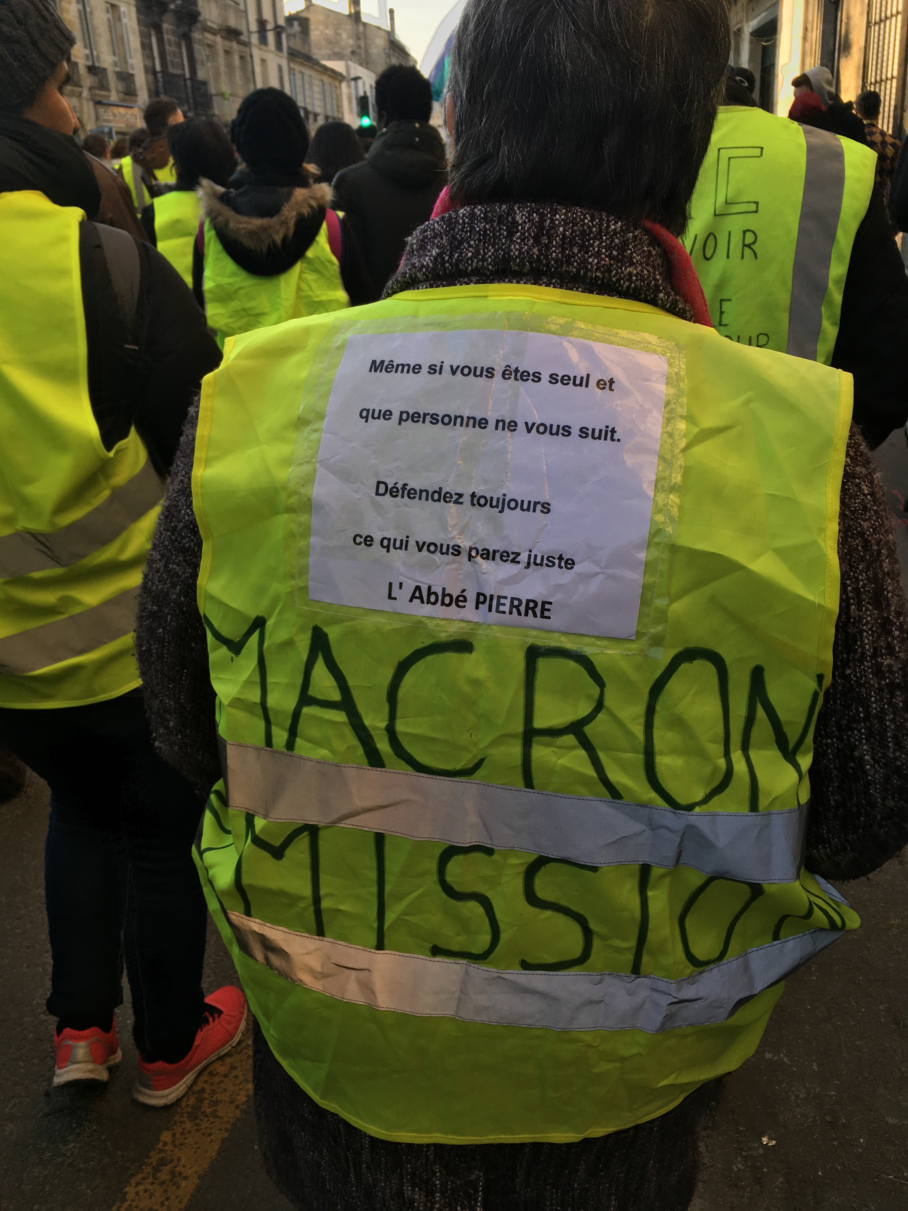 On marche beaucoup donc, on sautille au rythme de la musique, on applaudit, cette partie-là de l’histoire est joyeuse. Il me semble qu’Edgar Morin avait souligné l’importance de la joie et de la poésie en même temps que réfléchir et résister. Alors, appuyée par le philosophe, je reste avec cette fanfare sans trompette. Un samedi, nous sommes passés sous le tunnel qui mène à Mériadeck, et la musique résonnait, tout le monde était fou, dansait, criait, sautait, une sorte de grande montée heureuse et collective. À la sortie du tunnel, avec tous ces gilets jaunes partout, en grappe, on se surprend à des exaltations un peu stupides…