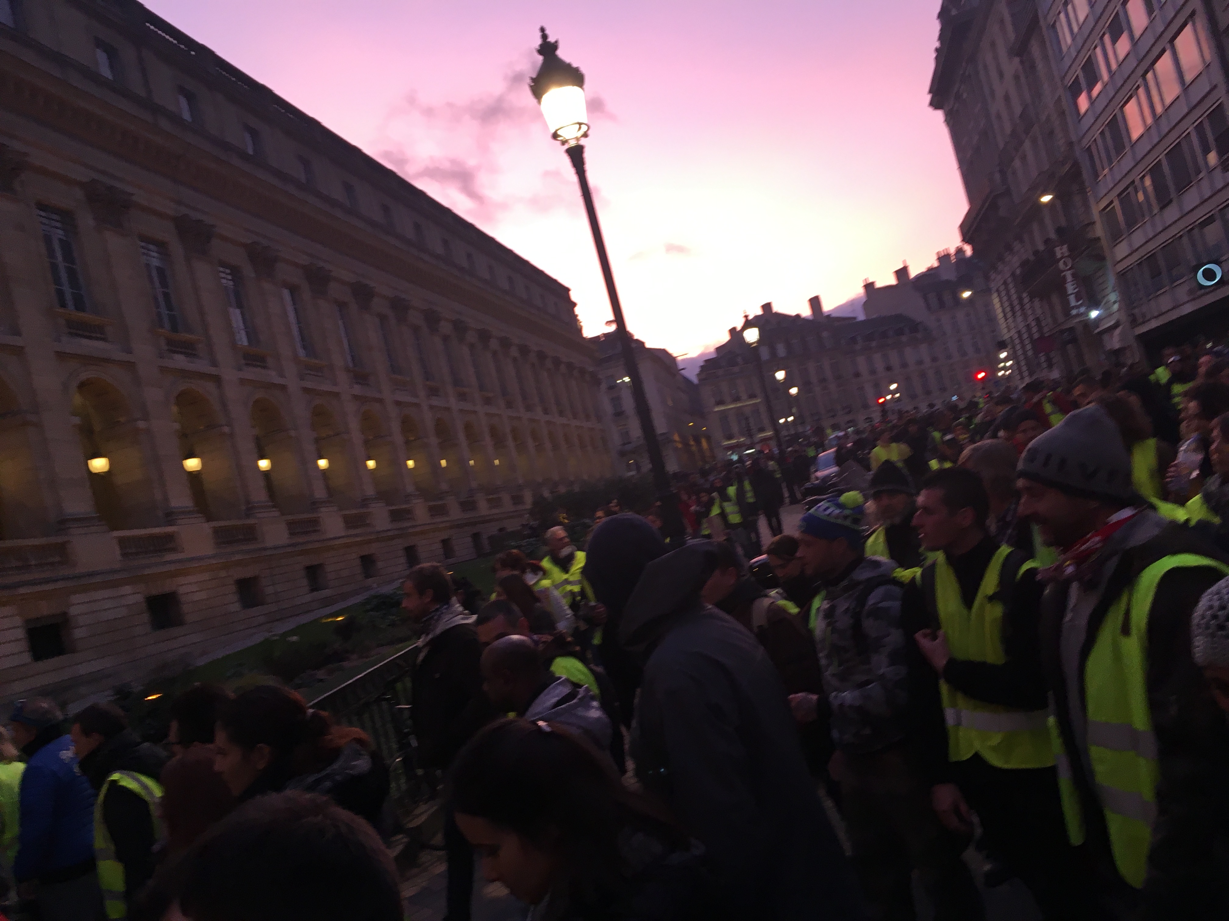 Quand la nuit tombe, c’est effrayant. Avec un peu d’adrénaline. On se met à courir parce que le gaz lacrymogène se répand et que les CRS chargent. Certains gilets jaunes disent un peu bêtement qu’on n’a rien fait. Si, on est là, devant ce mur, on empêche une autre vie de se dérouler, une vie dont d’autres gens ont besoin, on reste là parce qu’on ne peut pas rentrer chez nous tout de suite, pas comme ça, on a tellement marché qu’on a de la dopamine plein le cerveau, une euphorie collective, celle d’occuper l’espace public, de faire les grains de sable, on ne sait pas bien de quoi, les grains de sable…, on fait ça le samedi, une révolution de grains de sable, avec une vague.