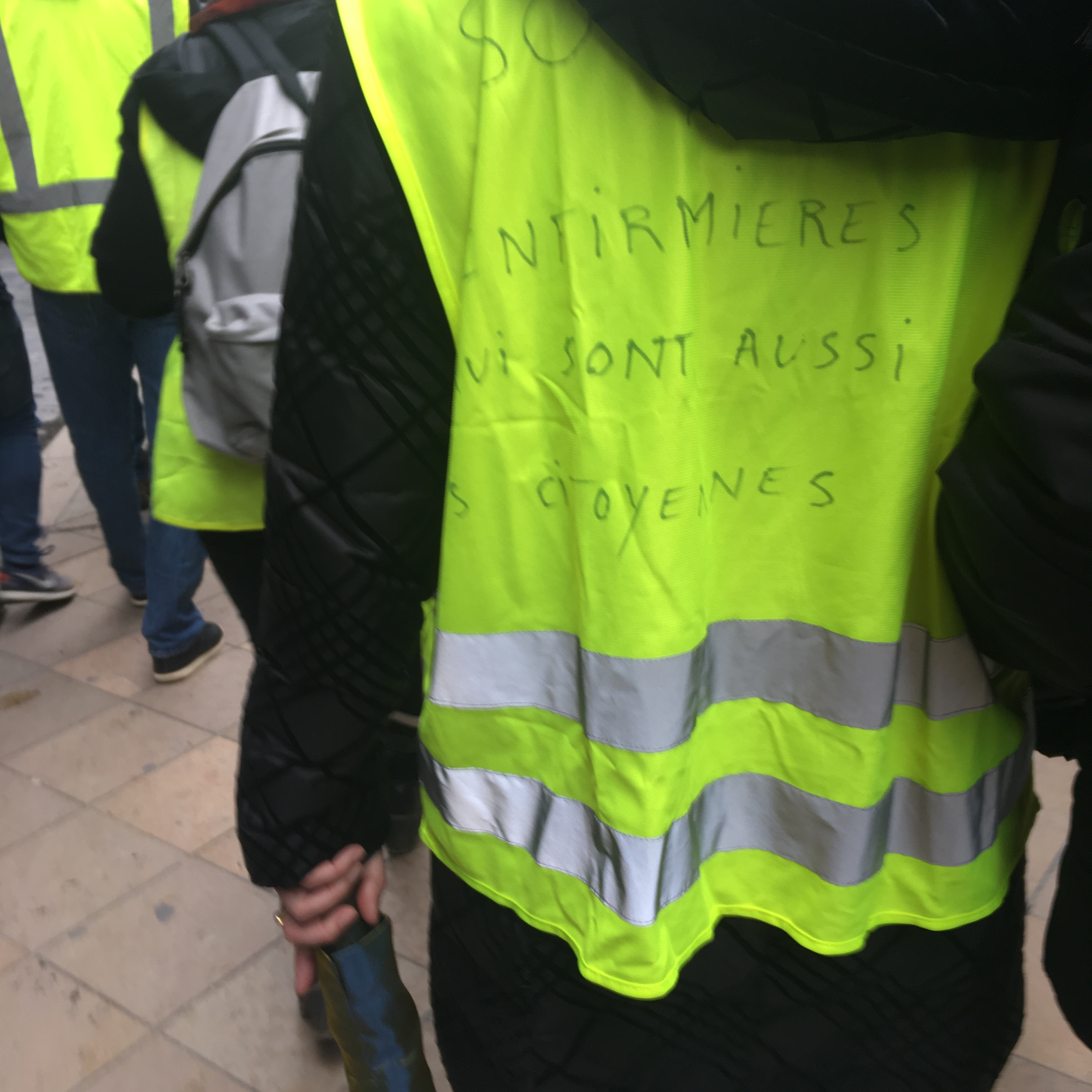 Je marche avec eux. Je n’ai pas de gilet. J’en avais un, je le mettais la nuit sur mon vélo, ça faisait marrer un peu, moi qui suis attentive à mon style, mais on m’a volé mon gilet jaune dans la sacoche il y a quelques mois.