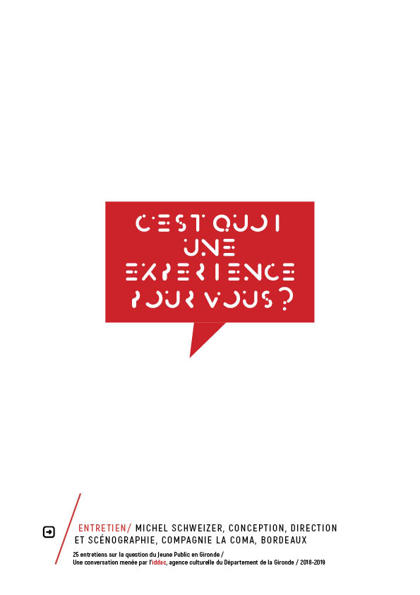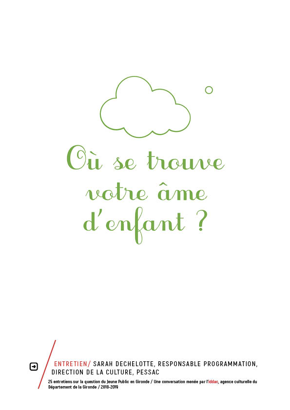L’iddac, agence culturelle de la Gironde, m’a demandé de concevoir une publication numérique qui rapporterait les réflexions de professionnels de la culture et/ou de l’enfance au sujet de la création artistique adressée à l’enfance et la jeunesse : « Où en est-on de la question du Jeune Public en Gironde ? »