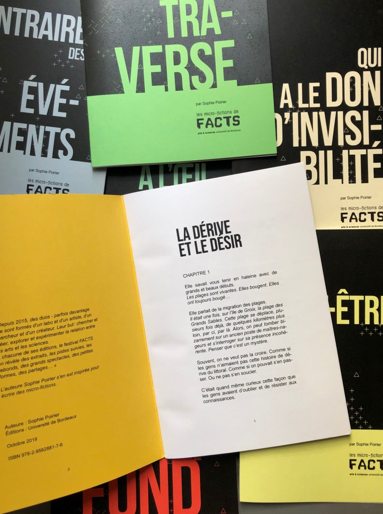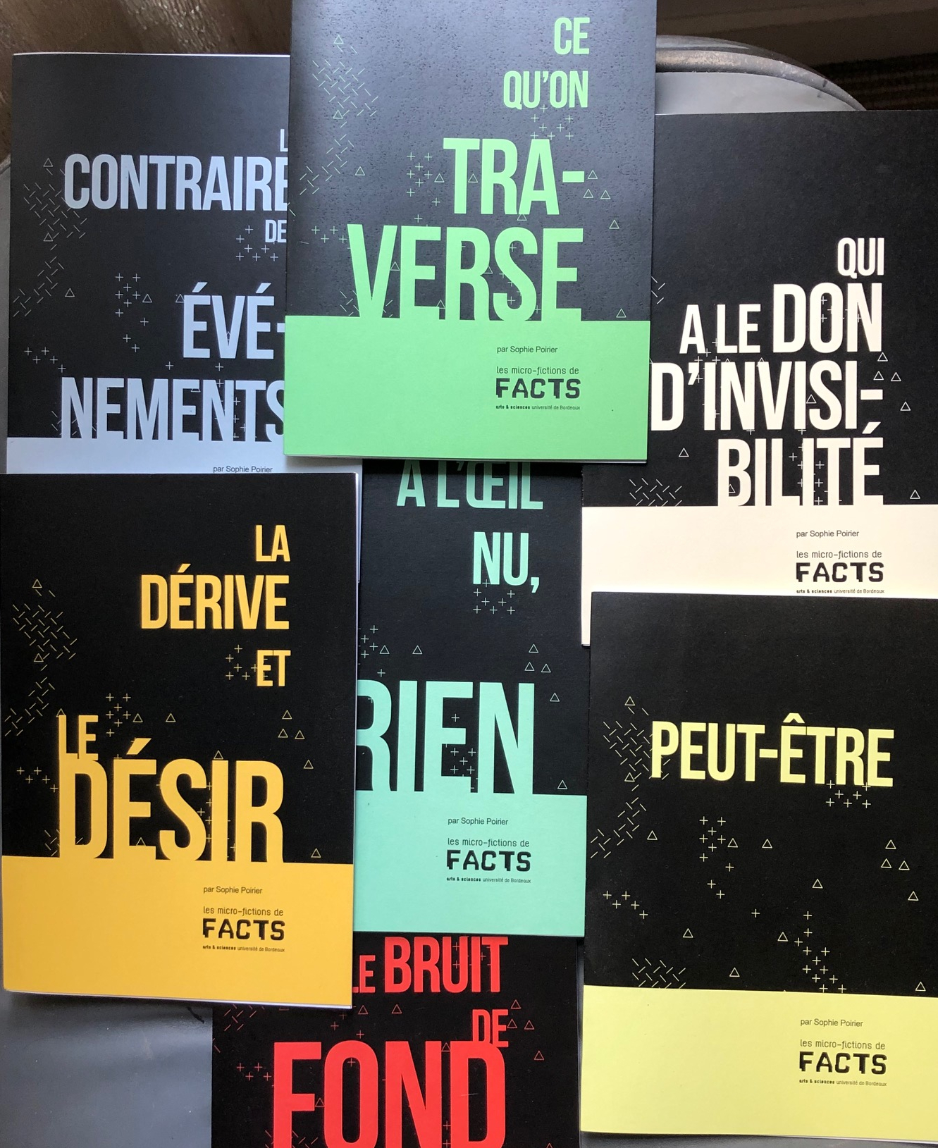 L’université de Bordeaux publie les micro-fictions de FACTS, sept histoires écrites par Sophie Poirier, inspirées de projets « arts et sciences ». À l’occasion de l’édition 2019 du festival FACTS, les textes sont diffusés en livres, lectures, affiches…