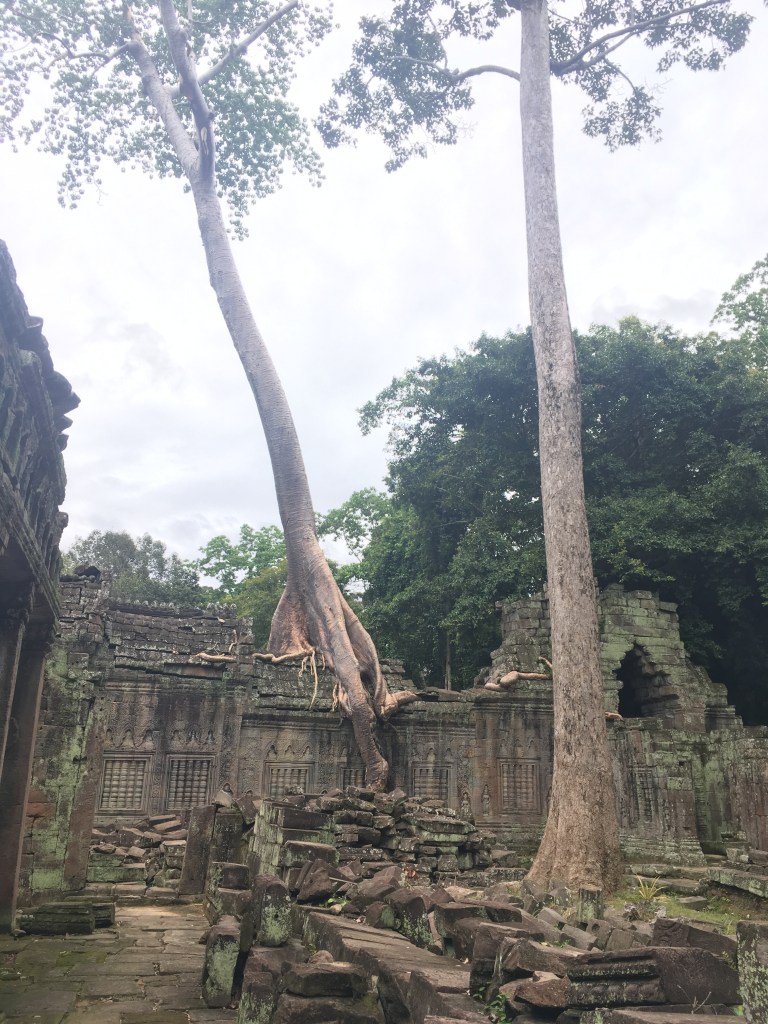 J’ai fermé les yeux. Un temple à Angkor, la pluie, se mettre à l’abri avec cette famille qui vend des souvenirs et des choses à manger, le grill qui fume, les crapauds qui sautent autour de nous, le père en attrape un et le coupe en deux et paf sur le barbecue, pourvu qu’il se le garde pour son repas personnel, les adolescentes penchées sur leur smartphone, on achète des impers en plastique rose, la longue route en vélo vers un autre temple, avec cette pluie infernale, je n’ai jamais été trempée jusqu’aux os, maintenant je sais, et je fais du vélo sous cette pluie diluvienne au milieu de la végétation immense.