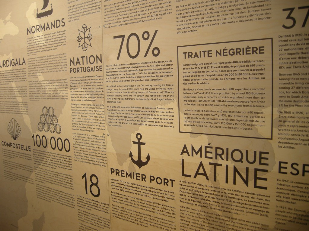 Dans le cartel du musée d’Aquitaine était écrit : « Au moins 4000 Noirs et gens de couleur viennent à Bordeaux au XVIIIe siècle. Il s’agit pour l’essentiel de domestiques, d’esclaves envoyés apprendre un métier, et d’enfants métis venus parfaire leur formation. (…) Dans le premier quart de siècle, les autorités veulent limiter un afflux (…) »