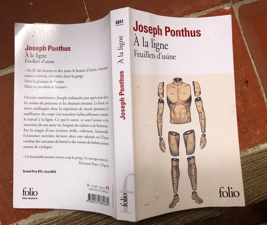 J’ai lu ce livre de Joseph Ponthus, À la ligne, feuillets d’usine. Et à regarder la couverture, je lui trouvais quelque chose de précieux – péjoratif – à ce titre ce sous-titre ce personnage dessiné et découpé en illustration – et je craignais une écriture chichiteuse, bête que je suis, donc maintenant je comprends les éloges, et le voilà devenu livre précieux – mélioratif, à faire lire à tout le monde.
