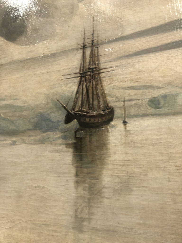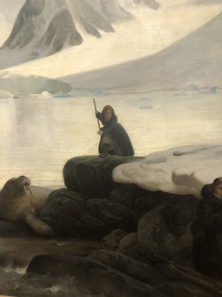 Sur le tableau, on distingue très bien le bateau de l’expédition, La Recherche. Je remarque le fusil posé au pied du peintre qui s’est représenté au premier plan mais sur le côté, en train de peindre, avec son pinceau à la main (comme si on pouvait peindre avec une température de 4°).