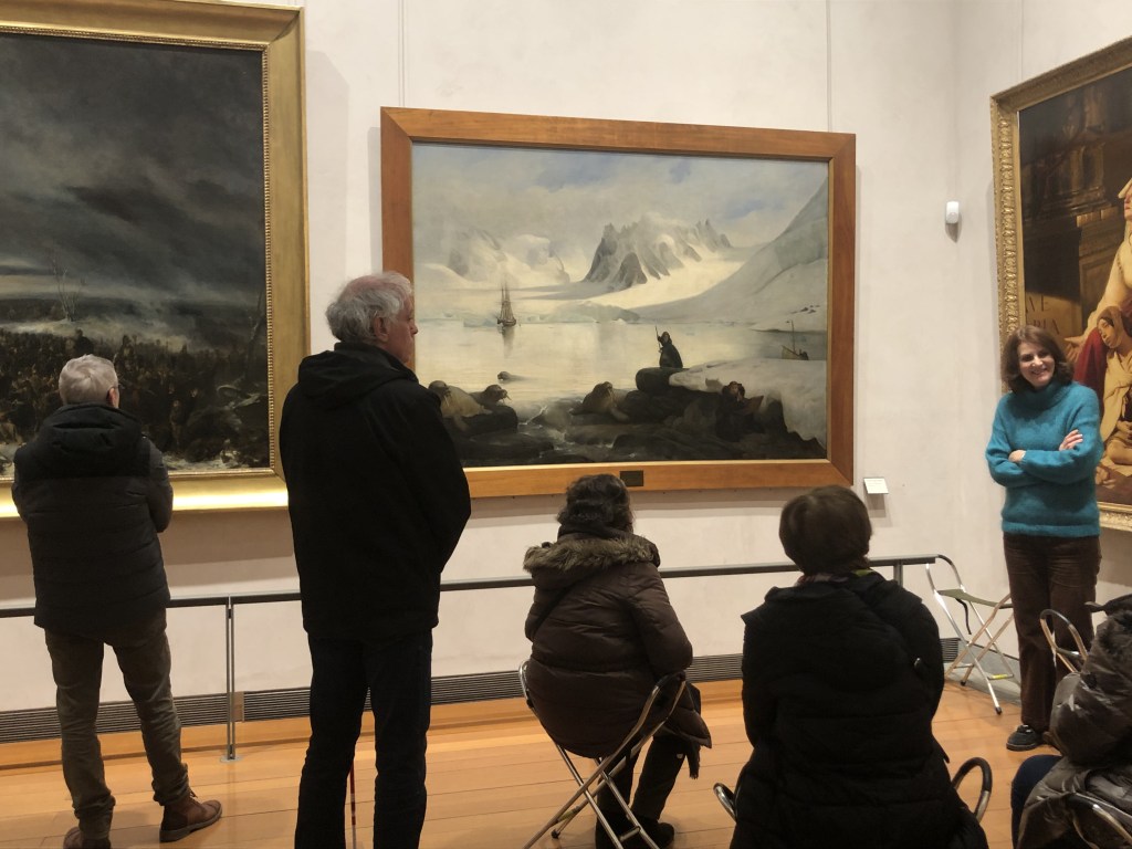 La guide s’attarde ensuite sur le paysage glaciaire. Là encore, elle lit à voix haute des extraits écrits par Léonie, quand elle décrit les formes et les couleurs de la banquise. Sont assis en rond sur des pliants, visiteurs et visiteuses, dont certains sont malvoyants et la guide fait toucher à l’un d’eux une reproduction plus petite du tableau, en relief, avec un petit visage de Léonie collé sur la forme qui la dessine.